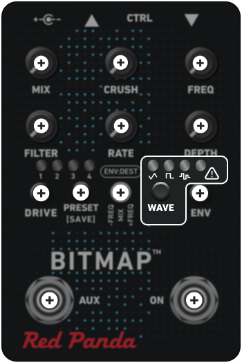 Press WAVE to select an LFO modulation or waveshaping style. The LFO modulates the sampling rate (FREQ) by default, but can be assigned to modulate the FILTER or MIX using the web editor or MIDI.