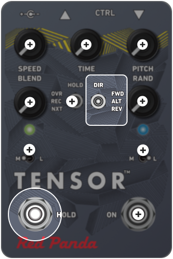 The DIR switch determines playback direction for an active loop and has no effect during live use. Because the SPEED knob also affects loop direction both live and during active looping, the two controls interact--if both controls are set to reverse playback, they cancel each other out and the loop will play forward.